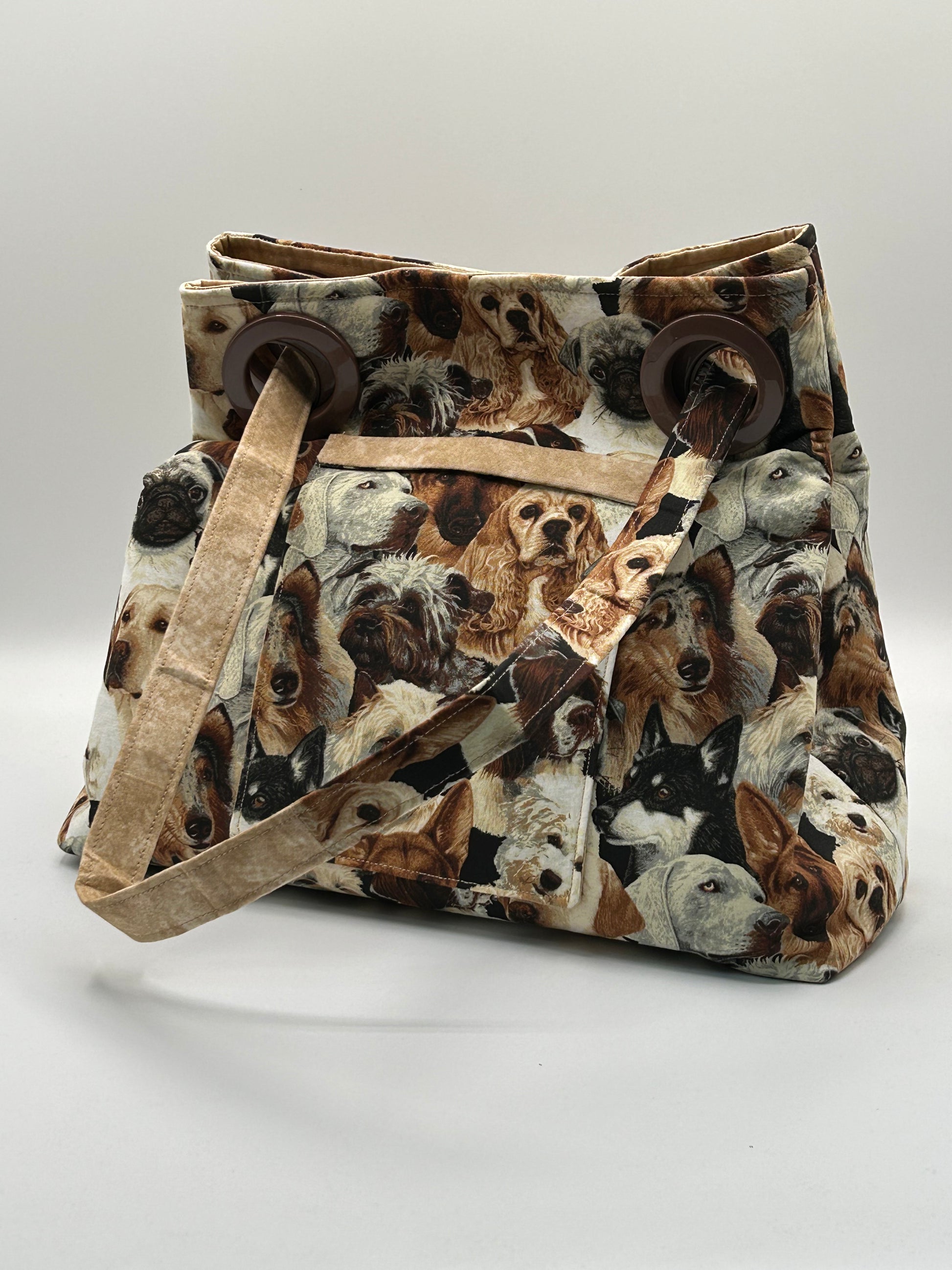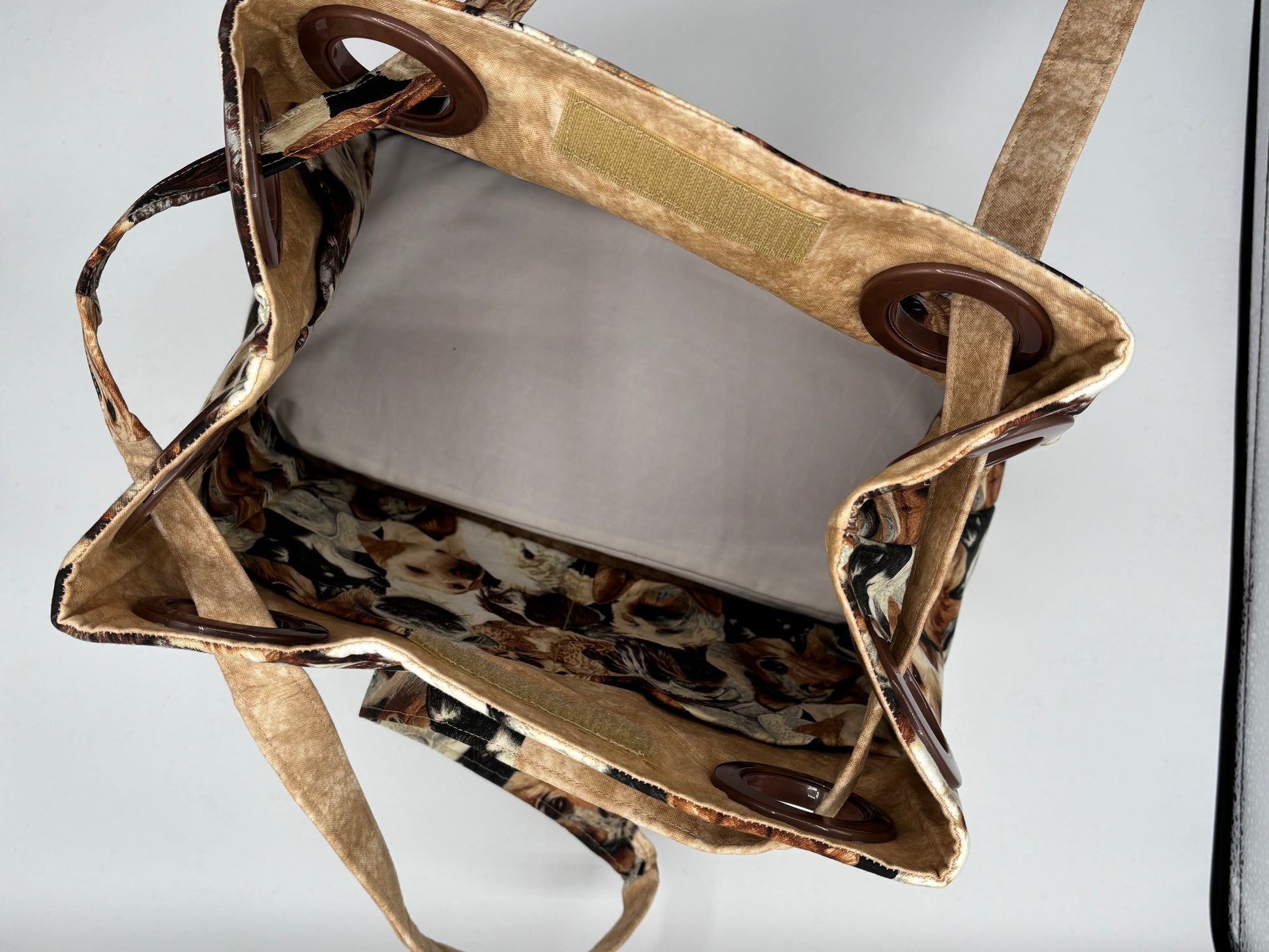 This bag is a handmade fabric handbag crafted with care and attention to detail. This bag features one exterior large pocket and eight interior pockets. This bag has a velcro closure that automatically closes when picked up. It has a hard bottom that can be removed so the bag can be washed. When you pull one side of the handle through the grommets it also becomes a crossbody! It measures approximately 11" in height, 14" in length and 7" wide. Perfect for everyday carry or special occasions, this versatile bag features durable fabric construction and a spacious interior to hold all your essentials. Each bag is individually made, ensuring unique character and quality craftsmanship.