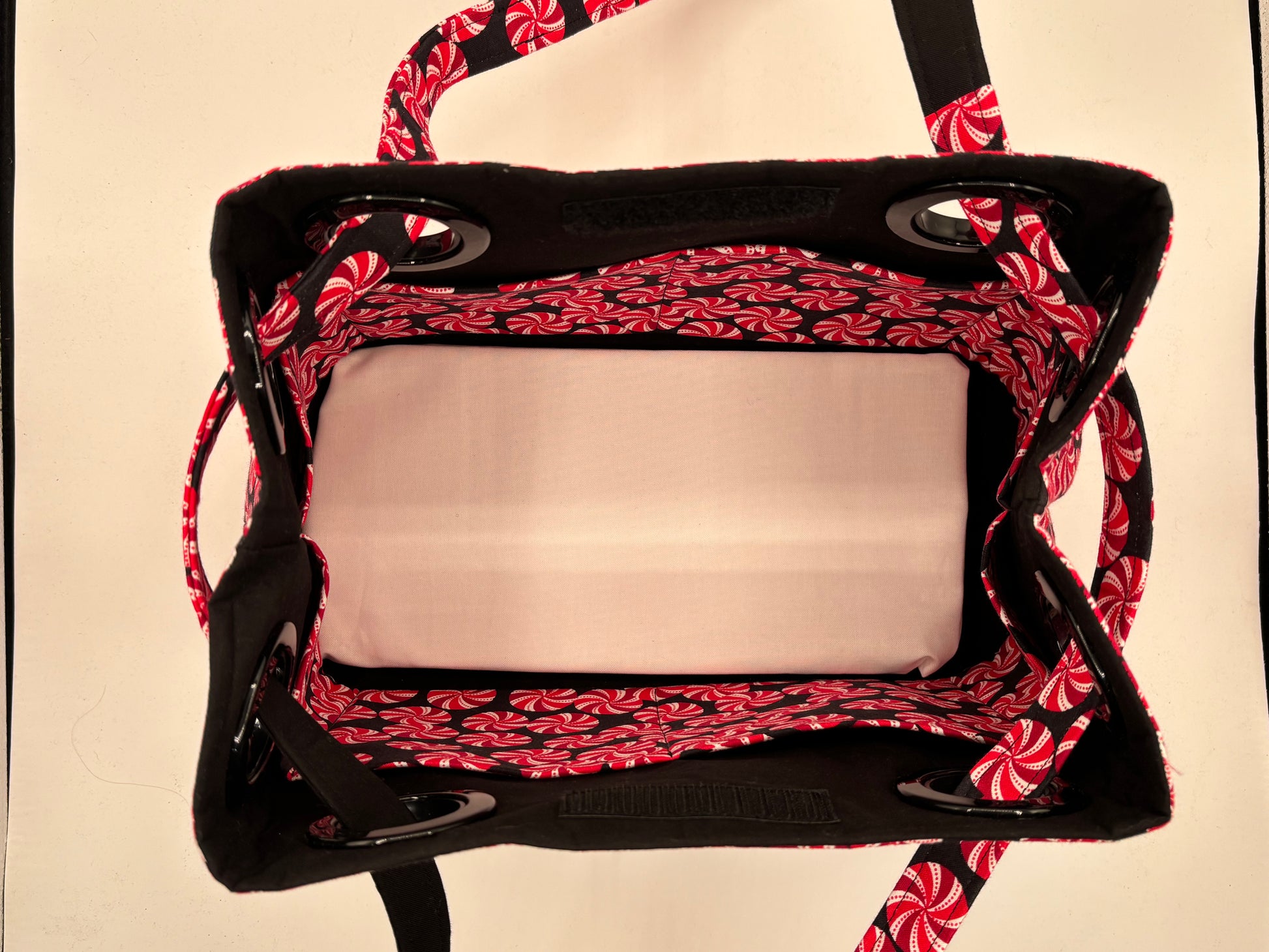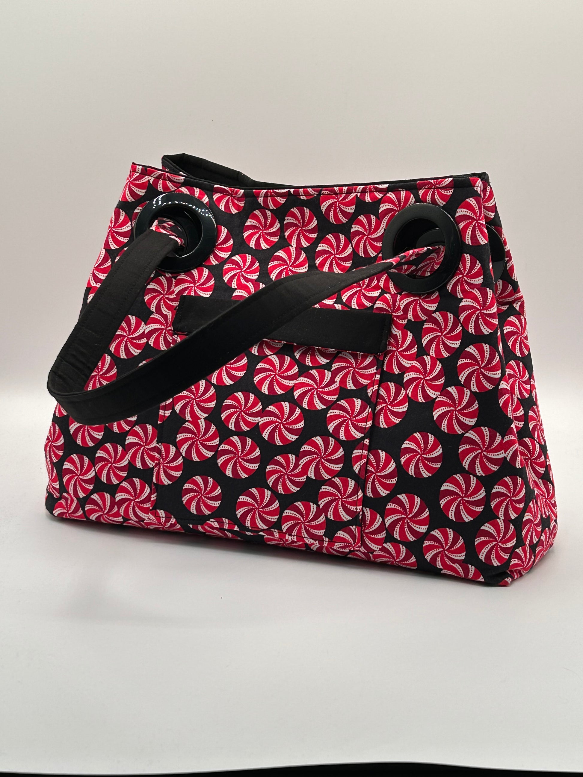 This bag is a handmade fabric handbag crafted with care and attention to detail. This bag features one exterior large pocket and eight interior pockets. This bag has a velcro closure that automatically closes when picked up. It has a hard bottom that can be removed so the bag can be washed. When you pull one side of the handle through the grommets it also becomes a crossbody! It measures approximately 11" in height, 14" in length and 7" wide. Perfect for everyday carry or special occasions, this versatile bag features durable fabric construction and a spacious interior to hold all your essentials. Each bag is individually made, ensuring unique character and quality craftsmanship.