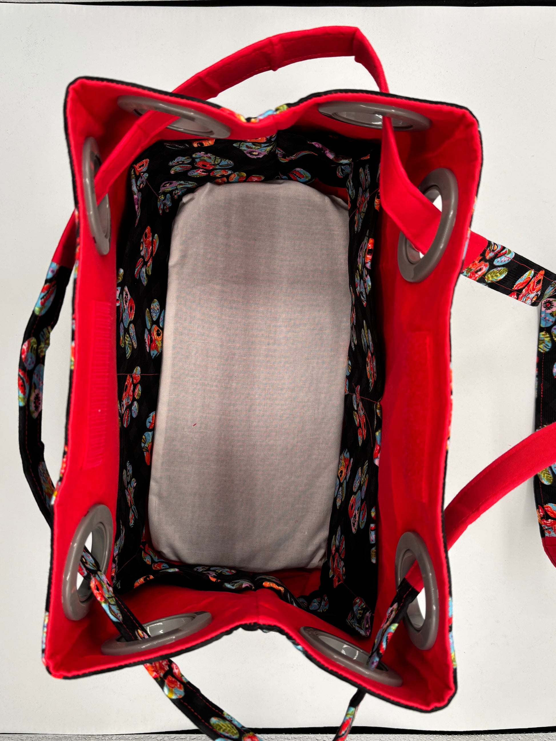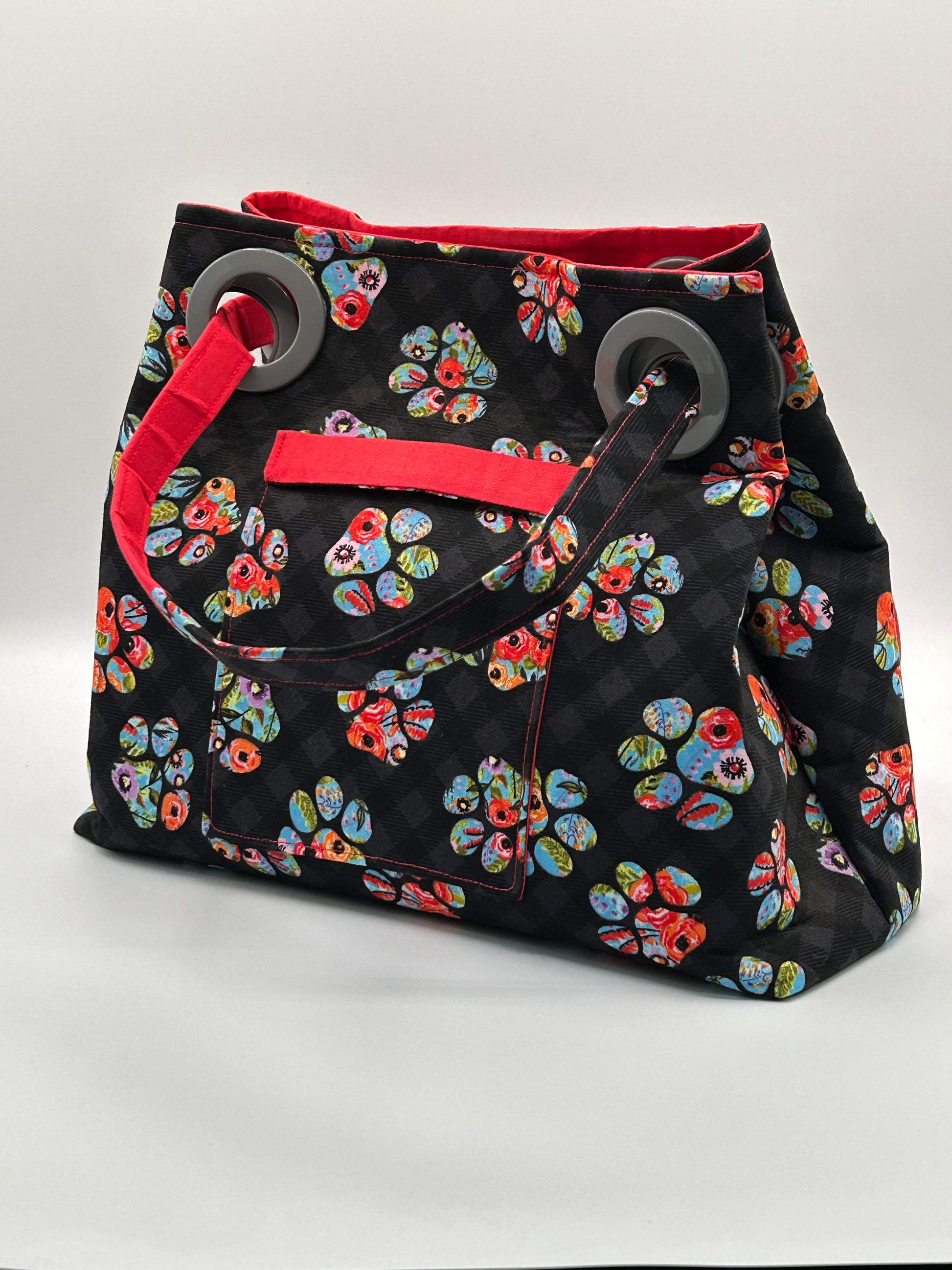 This bag is a handmade fabric handbag crafted with care and attention to detail. This bag features one exterior large pocket and eight interior pockets. This bag has a velcro closure that automatically closes when picked up. It has a hard bottom that can be removed so the bag can be washed. When you pull one side of the handle through the grommets it also becomes a crossbody! It measures approximately 11" in height, 14" in length and 7" wide. Perfect for everyday carry or special occasions, this versatile bag features durable fabric construction and a spacious interior to hold all your essentials. Each bag is individually made, ensuring unique character and quality craftsmanship.