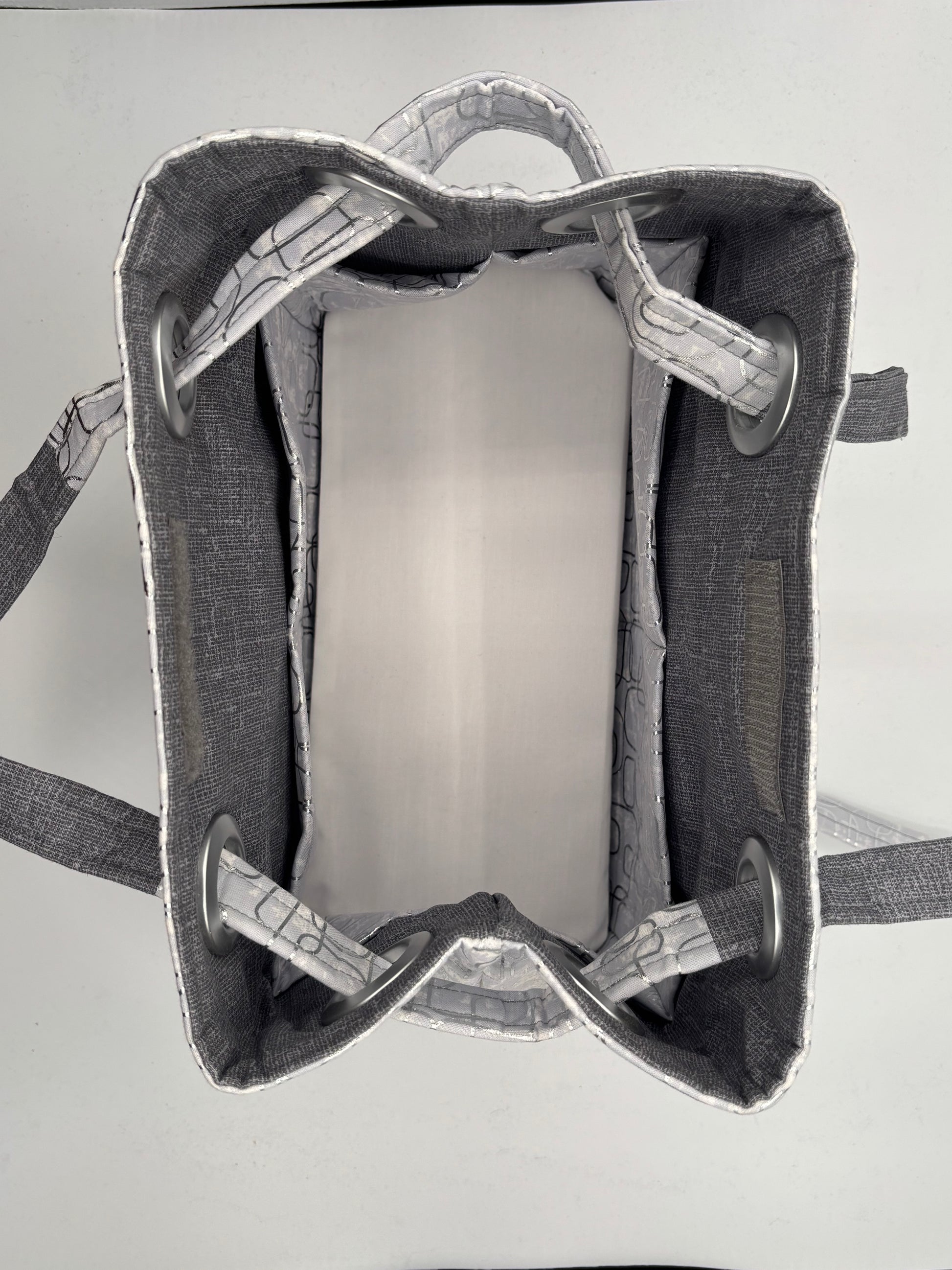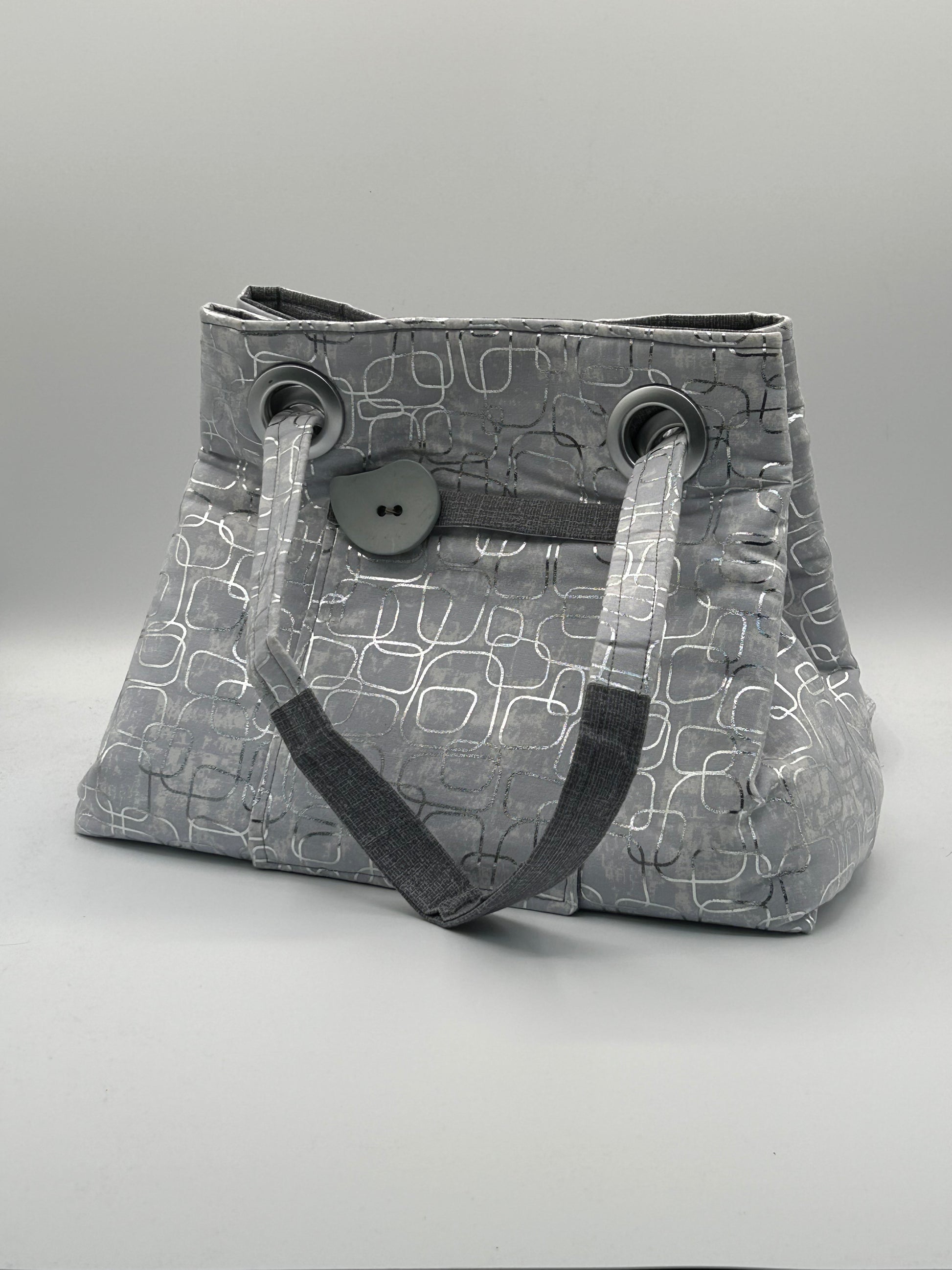 This bag is a handmade fabric handbag crafted with care and attention to detail. This bag features one exterior large pocket and eight interior pockets. This bag has a velcro closure that automatically closes when picked up. It has a hard bottom that can be removed so the bag can be washed. When you pull one side of the handle through the grommets it also becomes a crossbody! It measures approximately 11" in height, 14" in length and 7" wide. Perfect for everyday carry or special occasions, this versatile bag features durable fabric construction and a spacious interior to hold all your essentials. Each bag is individually made, ensuring unique character and quality craftsmanship.