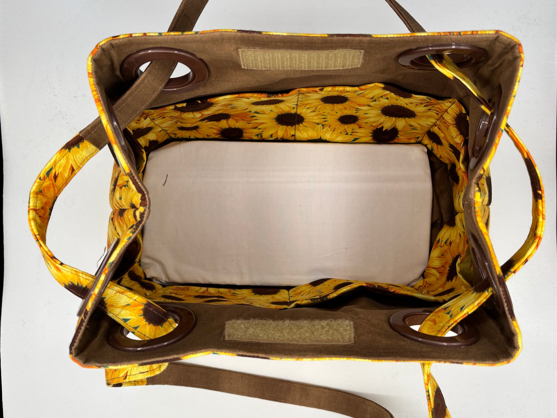 This bag is a handmade fabric handbag crafted with care and attention to detail. This bag features one exterior large pocket and eight interior pockets. This bag has a velcro closure that automatically closes when picked up. It has a hard bottom that can be removed so the bag can be washed. When you pull one side of the handle through the grommets it also becomes a crossbody! It measures approximately 11" in height, 14" in length and 7" wide. Perfect for everyday carry or special occasions, this versatile bag features durable fabric construction and a spacious interior to hold all your essentials. Each bag is individually made, ensuring unique character and quality craftsmanship.