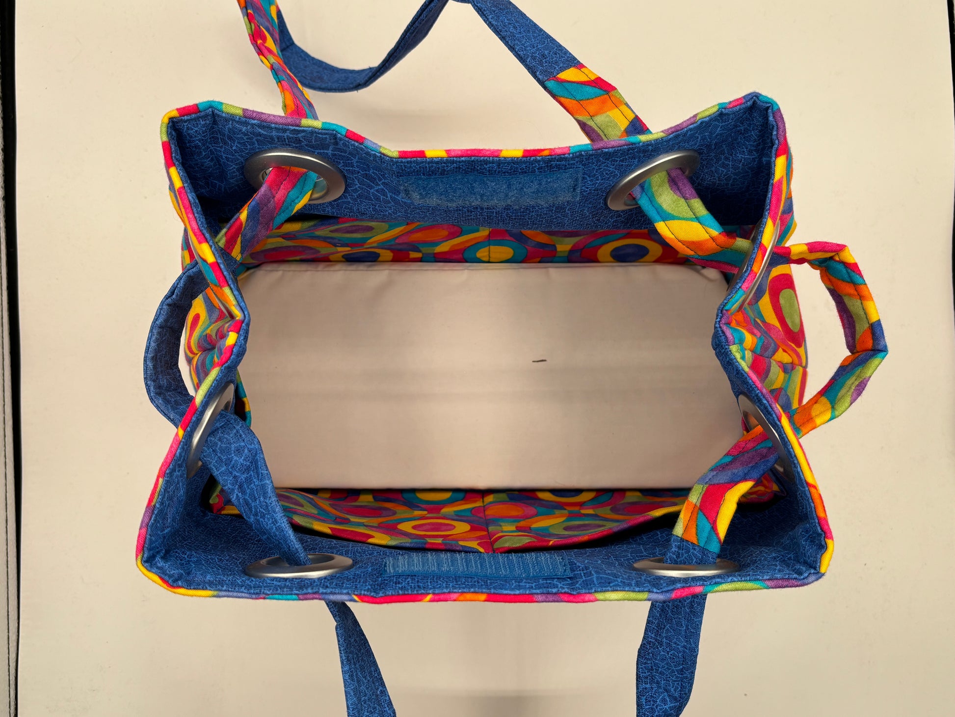 This bag is a handmade fabric handbag crafted with care and attention to detail. This bag features one exterior large pocket and eight interior pockets. This bag has a velcro closure that automatically closes when picked up. It has a hard bottom that can be removed so the bag can be washed. When you pull one side of the handle through the grommets it also becomes a crossbody! It measures approximately 11" in height, 14" in length and 7" wide. Perfect for everyday carry or special occasions, this versatile bag features durable fabric construction and a spacious interior to hold all your essentials. Each bag is individually made, ensuring unique character and quality craftsmanship.